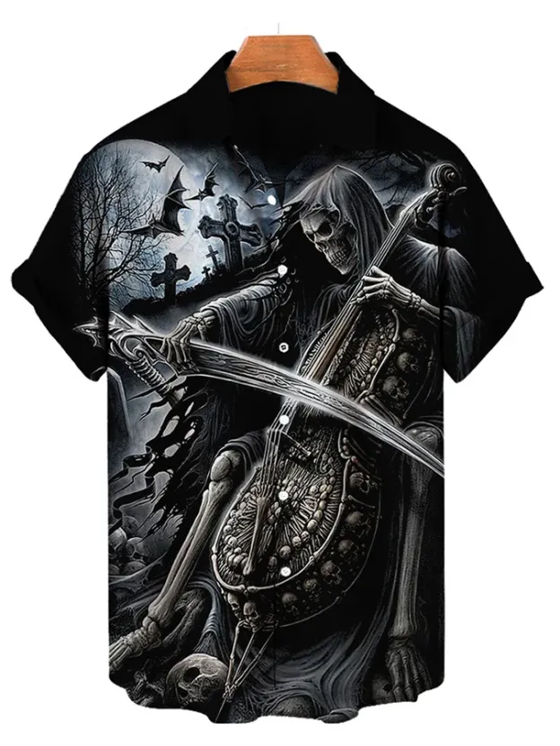 Men's casual music violin skull short sleeved pocket shirt