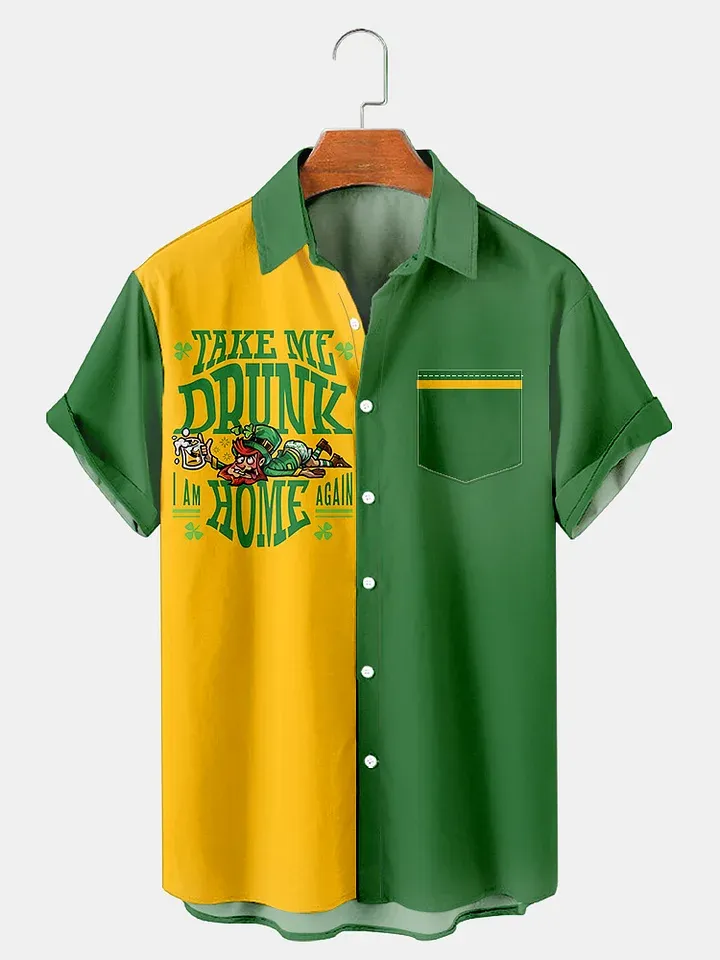 Take Me Drunk Men's Saint Patrick Holiday Colorblock Printed Pocket Shirt