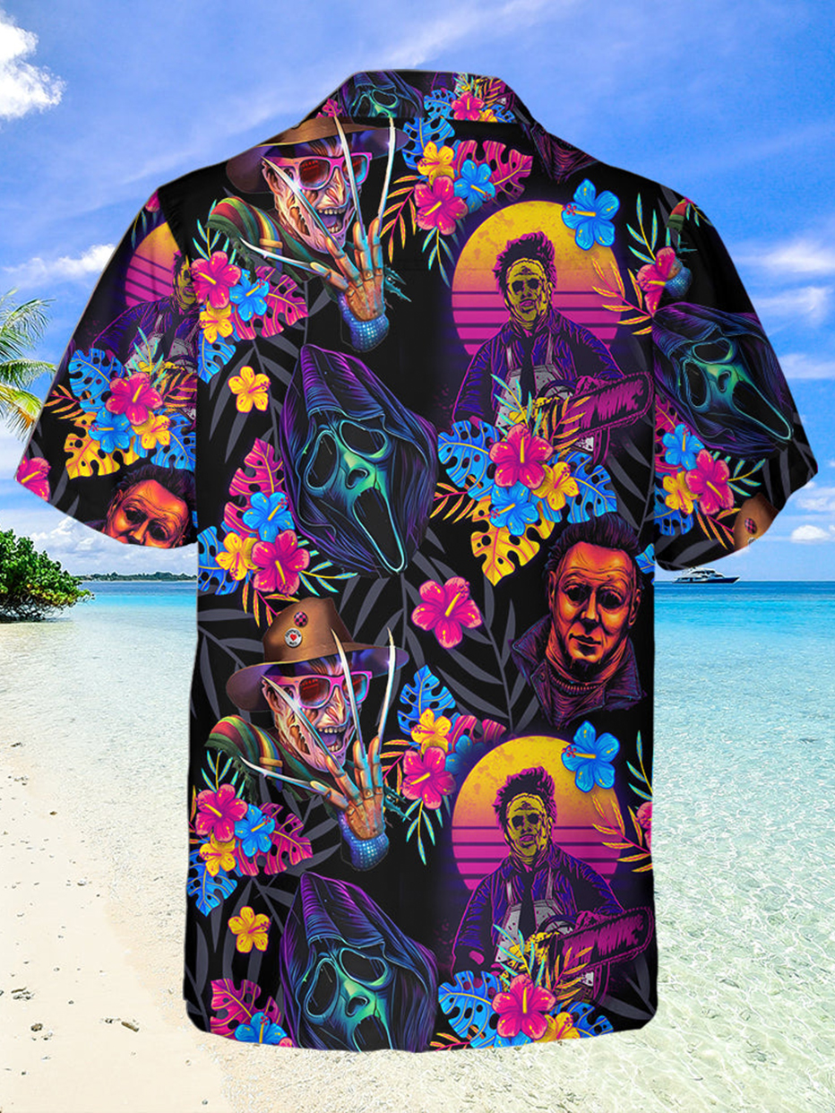 Halloween Horror Movie Character Print Short Sleeve Hawaiian Cuban Collar Shirt