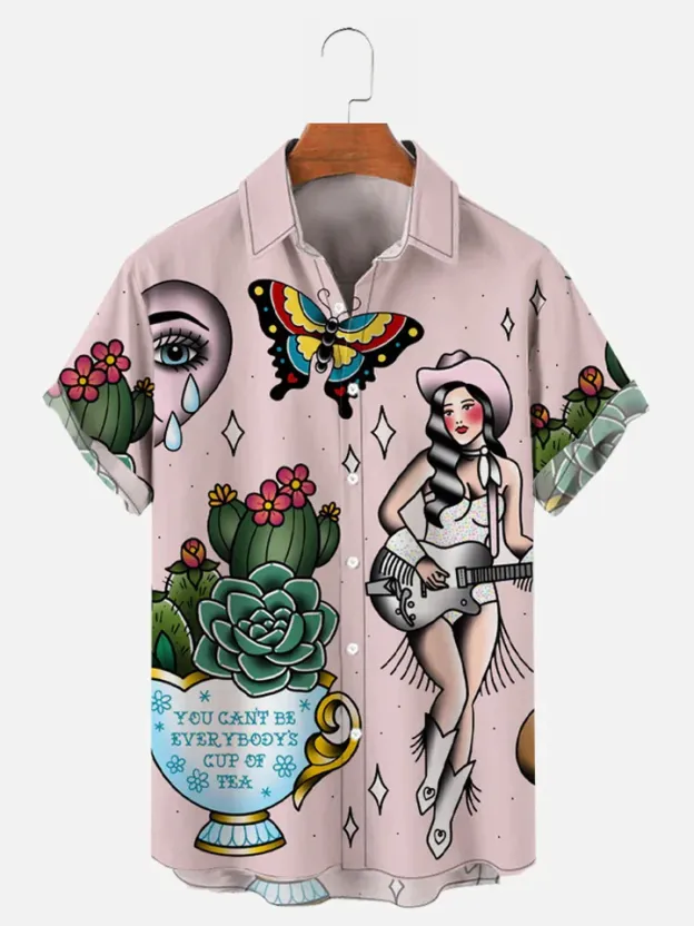 Men's casual Western girl denim printed flip collar short sleeved shirt