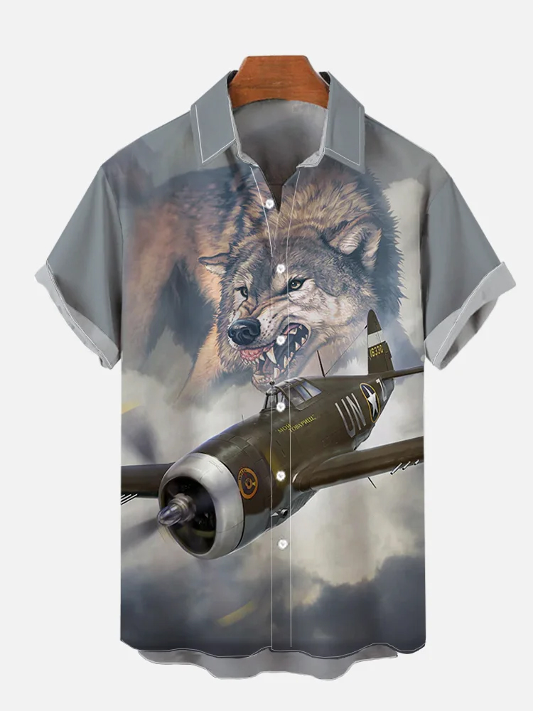 Men's Gray Fighter and Wolf Print Short Sleeve Shirt