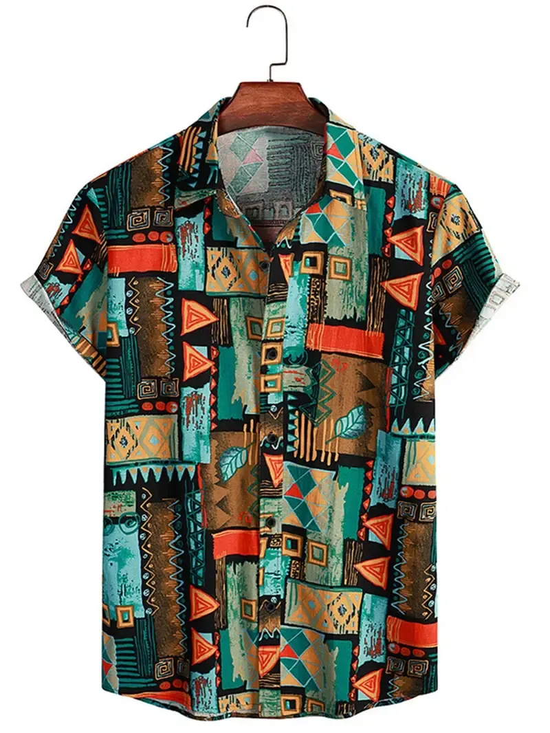 Men's Retro Casual Shirt, Men's Geometric-pattern Short Sleeve Shirt
