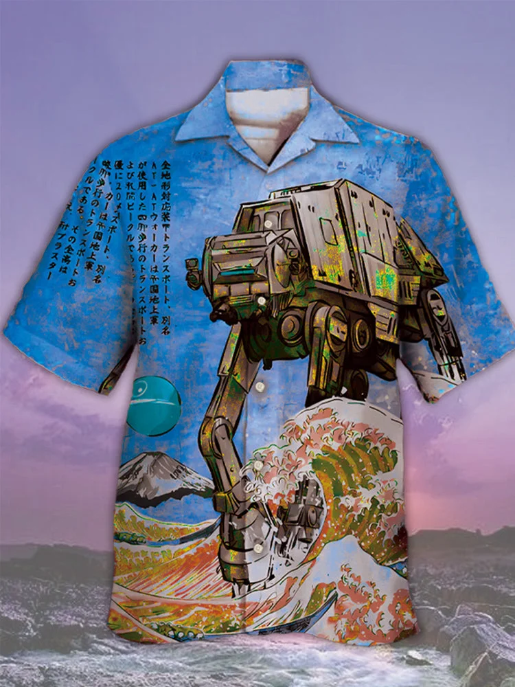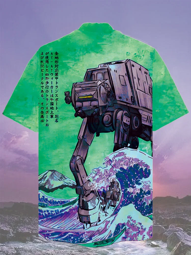 Men's Comfortable Ukiyo-e Mecha Armor Cuban Collar Print Shirt