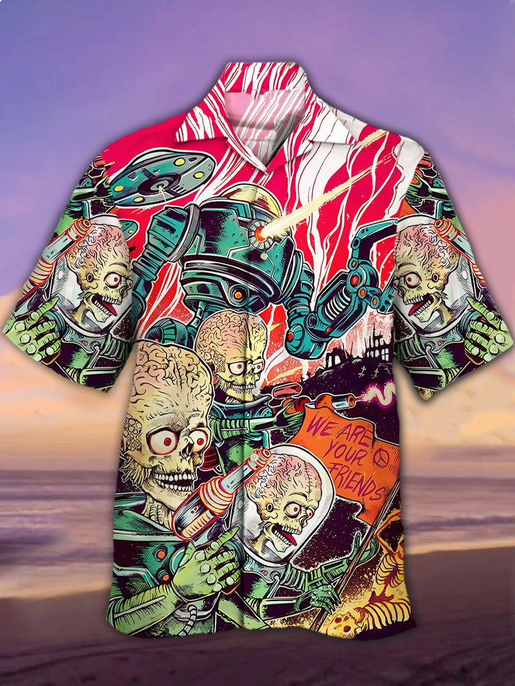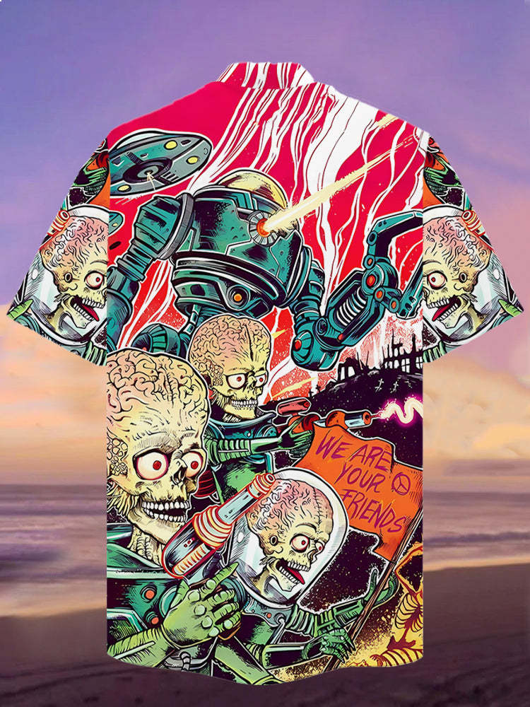 Men's Retro Horror Alien Warrior Cuban Collar Short Sleeve Shirt